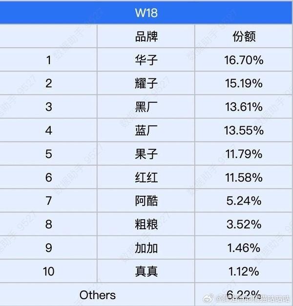 近日,有數碼博主放出W18第十八周國內手機市場數據,具體品牌排名和份額如下: