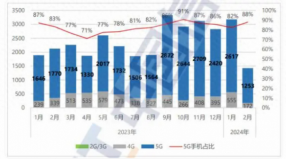 最近,中國信通院公布了一組相關(guān)市場報告,數(shù)據(jù)顯示,2024年2月,國內(nèi)市場手機出貨量1425.7萬部,同比下降32.9%,其中,5G手機1253.2萬部,同比下降29.2%。