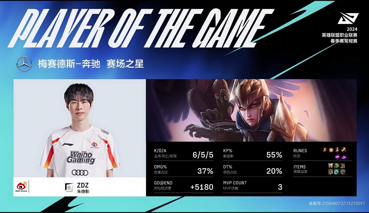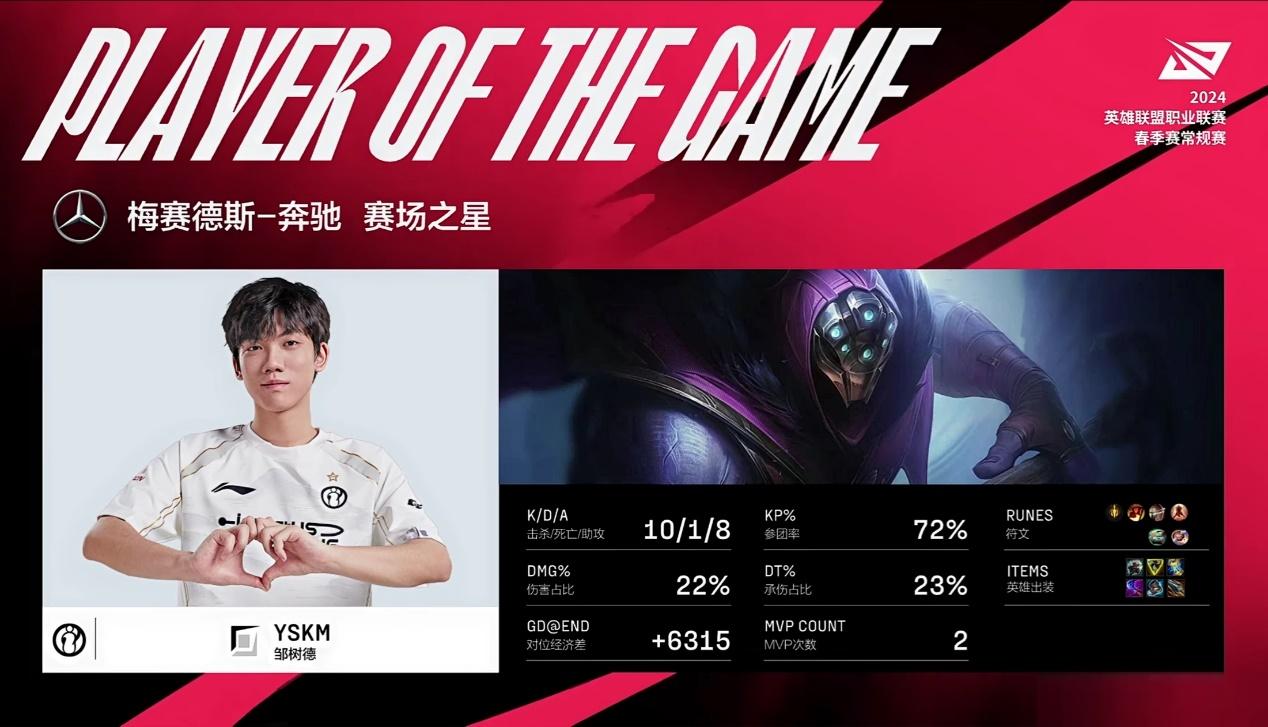 結果IG戰隊是前中期贏了好多波團戰,但一波被Zdz下路操作,就直接導致局勢崩盤,值得一提的是這局比賽Zdz是致敬了一波The Shy,選出了奎因來對線鱷魚,前期接連遭遇針對陣亡,后面還是成功起飛1V3秀起操作幫助隊伍取勝最終拿下MVP。