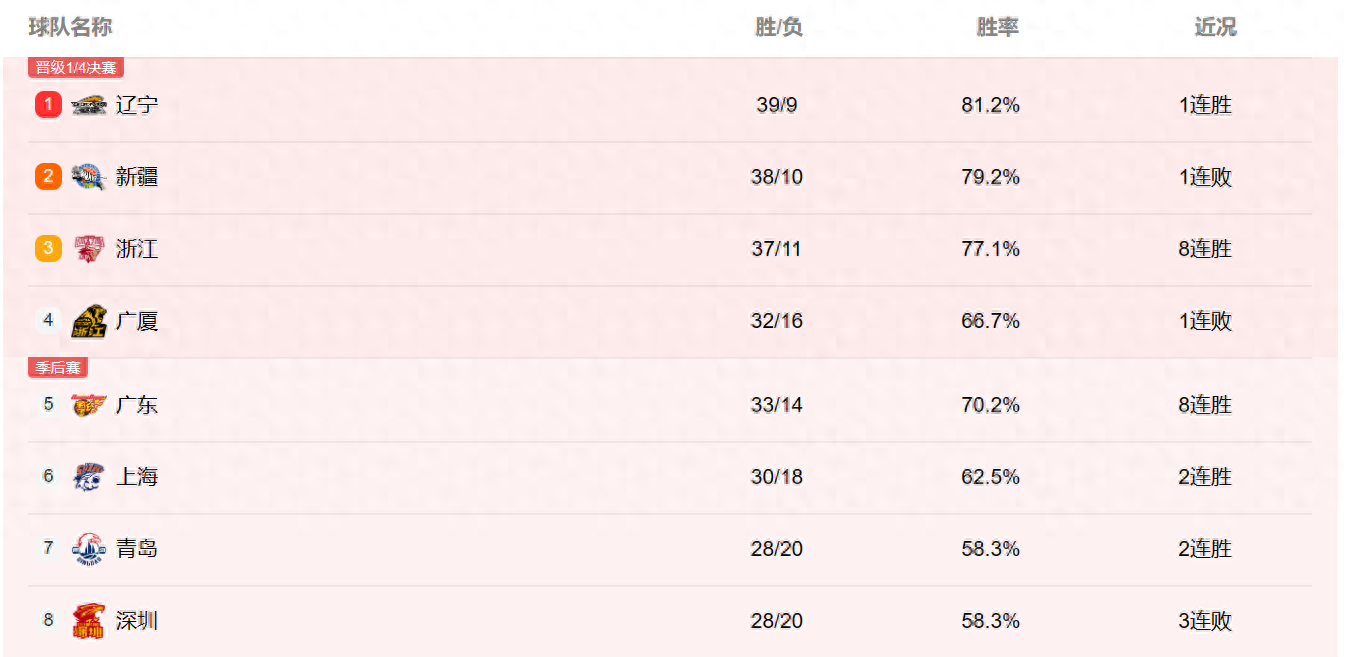 CBA常規賽四強排名基本已定,遼寧鎖定第一!