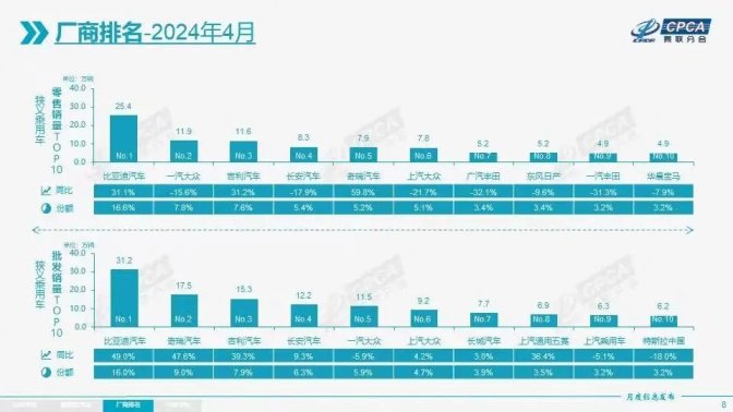 5月10日,乘聯會發布4月份車企乘用車銷量排行榜前十名,4月份乘用車零售153.2萬輛,同比下滑5.7%,環比下滑9.4%,2024年前四個月累計銷量為636.4萬輛,同比增長8%。