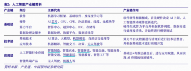 從產(chǎn)業(yè)鏈看,其中基礎(chǔ)層設(shè)計導(dǎo)的有軟件諸如學(xué)習(xí)框架,應(yīng)用軟件和深度學(xué)習(xí)軟件。硬件包括AI芯片、GPU、CPU以及配套的冷卻系統(tǒng)、線纜和光模塊。算力平臺就是以運算為主的主機機房和存儲機房。技術(shù)層面就是相關(guān)的邏輯算法、視覺和語言處理系統(tǒng),機器翻譯系統(tǒng)、交互監(jiān)控系統(tǒng)等。應(yīng)用層面就是與各個不同的應(yīng)用領(lǐng)域的應(yīng)用情況。