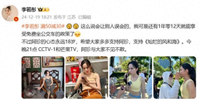 李若彤曬出多張個人美照寫道:“這么說會讓別人誤會的,我可是還有1年零12天就能享受免費(fèi)坐公交車的政策了。不過阿珍的心態(tài)永遠(yuǎn)18歲,希望大家多多支持阿珍,支持《燦爛的風(fēng)和海》。”