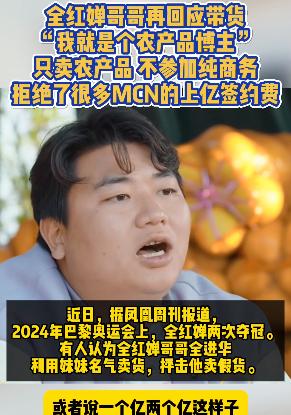 近日,據鳳凰周刊報道,2024年巴黎奧運會上,全紅嬋兩次奪冠。有人認為全紅嬋哥哥全進華利用妹妹名氣賣貨,抨擊他賣假貨。全進華表示,大部分信任是來源于妹妹全紅嬋,因此會把東西做好,不失去信任。