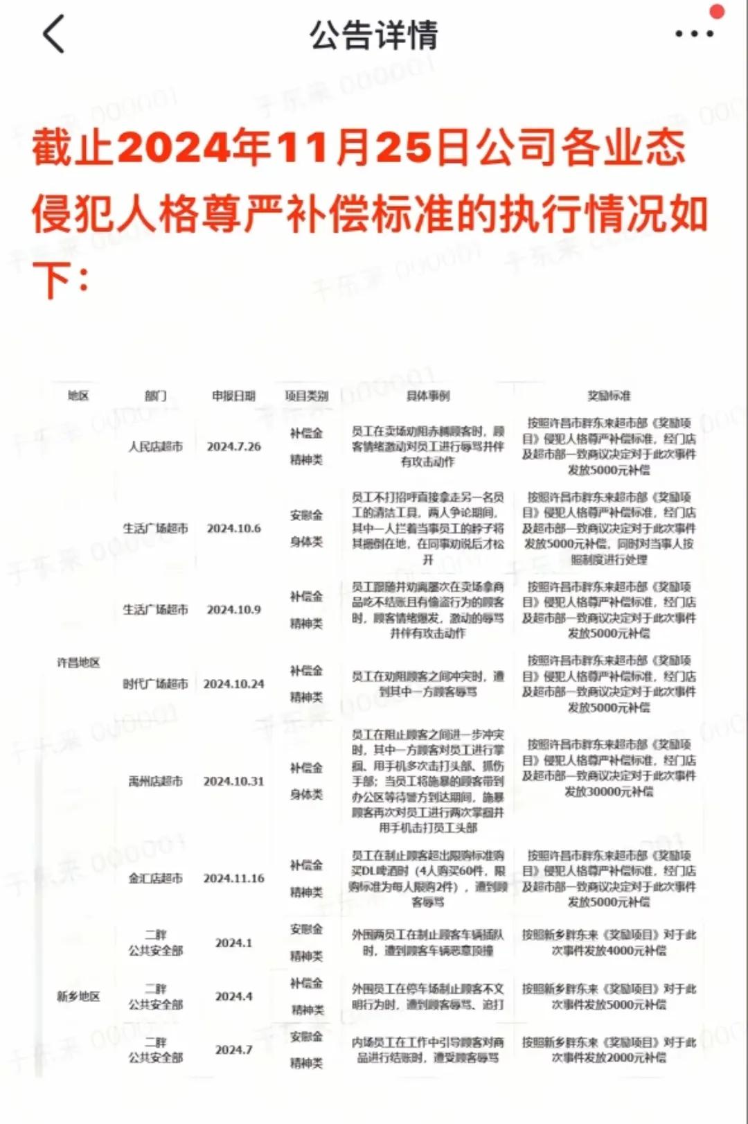 今天胖東來創始人在社交媒體公開了截止 2024 年 11 月 25 日,許昌和新鄉 13 家店面遭到侵犯人格尊嚴的補償標準執行情況。