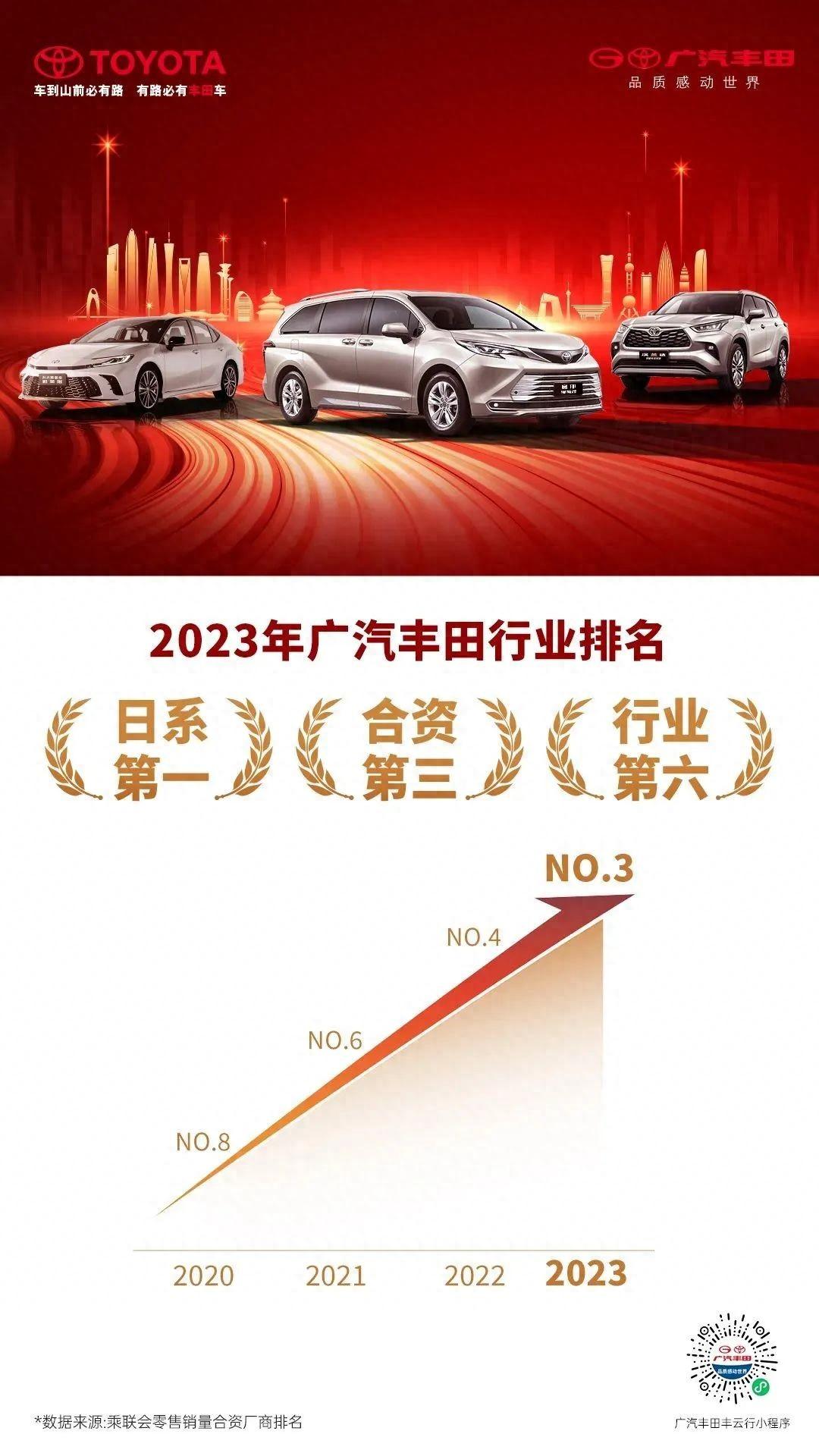 當下的汽車市場,卷價格、卷營銷、卷科技,競爭激烈而殘酷,廣汽豐田以其卓越的品質和不懈的創新精神,在內卷的行業背景下脫穎而出。2023年,廣汽豐田不僅取得了日系第一、合資第三、行業第六的佳績,其位次更較2022年前進一位,穩居合資第一陣營。