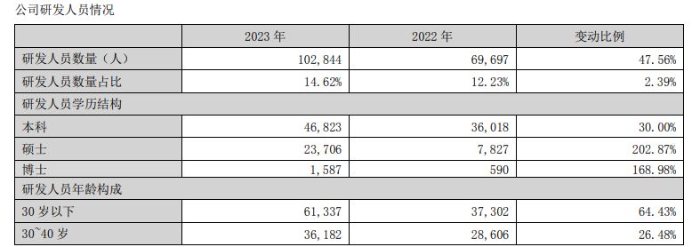 此外,比亞迪還十分重視對大學畢業生及社會上的研究開發人員的引進。在2023年,該公司招募了33,000名新的 R& D員工,這將使整個 R& D員工總數增加到102,000人。研究開發人才中,年齡不超過30歲的占60%。在業績報告中,比亞迪還宣布了其研發團隊的平均薪資水平,為21.2萬元。