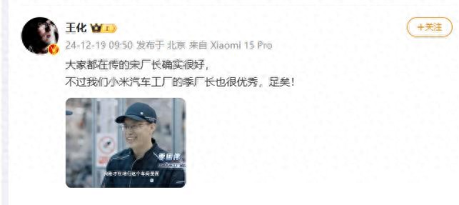 12月19日,小米公關部總經理王化發布微博稱:“大家都在傳的宋廠長(宋鋼)確實很好,不過我們小米汽車工廠的季廠長(季國偉)也很優秀,足矣!”