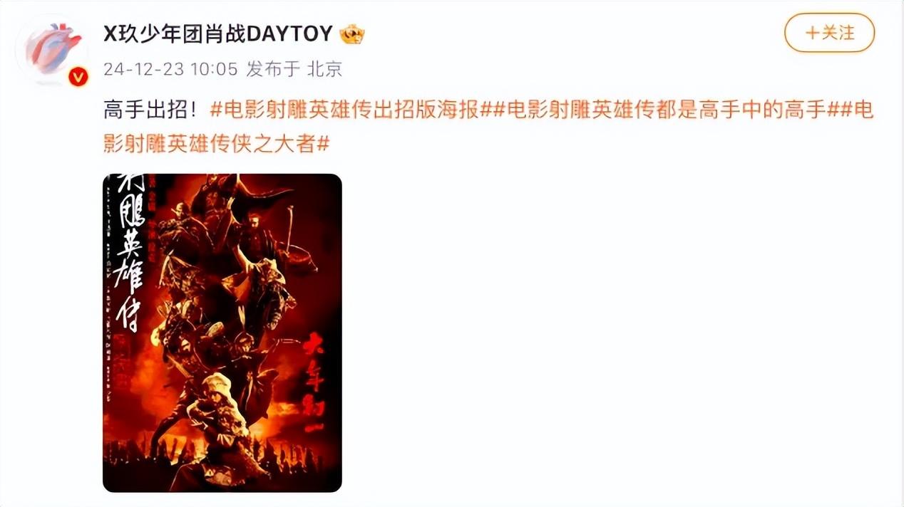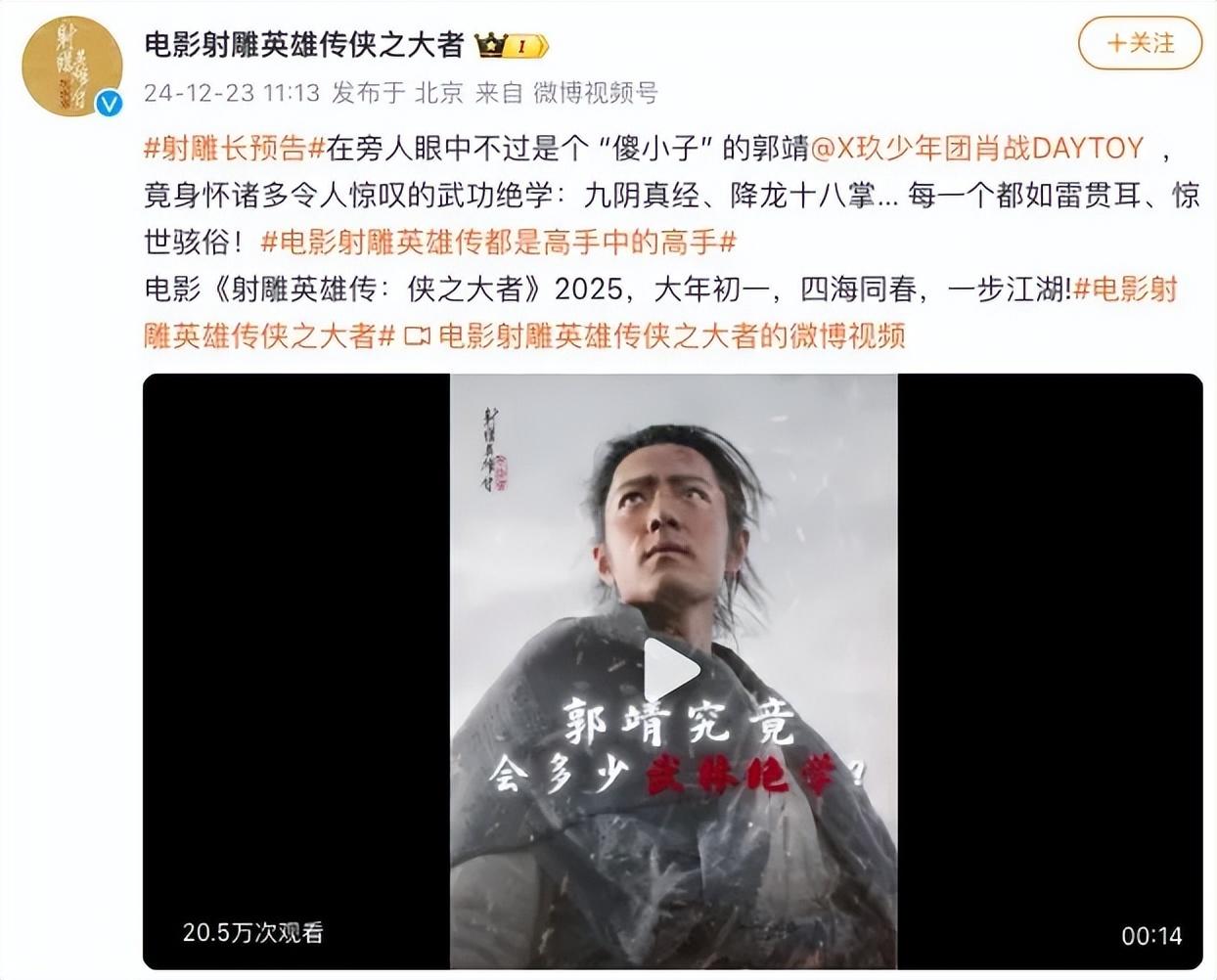 電影《射雕英雄傳:俠之大者》官微發文稱,“在旁人眼中不過是個 ‘傻小子’的郭靖,竟身懷諸多令人驚嘆的武功絕學,九陰真經、降龍十八掌……每一個都如雷貫耳、驚世駭俗!電影《射雕英雄傳:俠之大者》2025,大年初一,四海同春,一步江湖!”