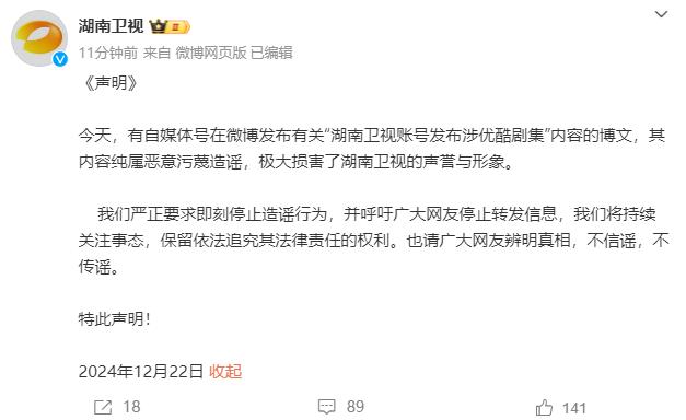 今天,有自媒體號在微博發布有關“湖南衛視賬號發布涉優酷劇集”內容的博文,其內容純屬惡意污蔑造謠,極大損害了湖南衛視的聲譽與形象。