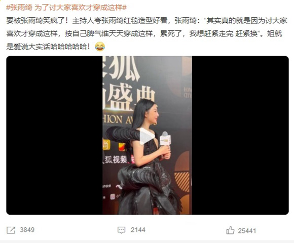那身禮服簡直是一件精美的藝術品,黑色的底色深邃神秘,深 V 設計大膽而又不失韻味,禮服之上的蝴蝶裝飾宛如被施了魔法,靈動鮮活,好似下一秒就要振翅高飛,沖入那浩瀚星空。張雨綺在其映襯下,身姿恰似搖曳生姿的柳枝,柔美婀娜,事業線就像藏在云霧中的一抹春光,若隱若現,那兩條大長腿更是如同兩根筆直的玉柱,吸睛程度爆表。就在眾人沉浸于對其美貌與身材的嘖嘖稱贊之中時,張雨綺在采訪環節卻像是打開了一扇通往真實內心世界的大門,讓眾人看到了她那真性情的寶藏。