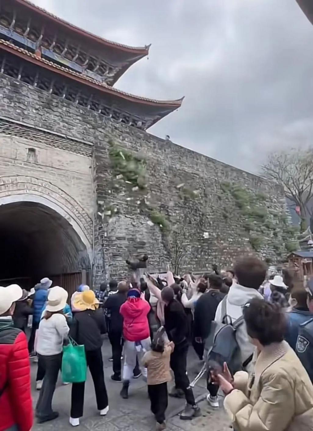相關視頻顯示,有人從古城上拋撒大量現金,圍觀市民游客紛紛湊上前搶奪。古城保護管理局回應:這不是景區行為,撒錢的老人是游客,不清楚他具體撒了多少錢,他的家人已經將他帶走了。