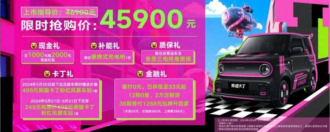 5月9日,吉利熊貓卡丁正式上市,新車共推出1款車型,指導價4.69萬元,限時搶購價僅需4.59萬元。新車設計靈感源自卡丁車,采用單電機布局,CLTC續航200km。