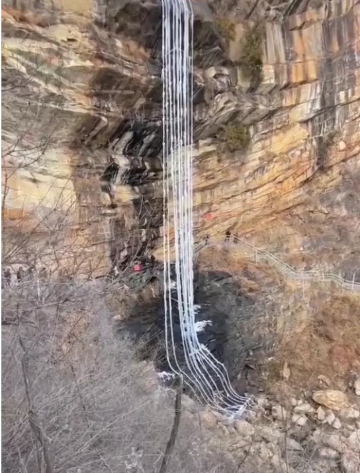 驢友楊先生(化名)在河南嵩山旅游時發現,當地的盧崖瀑布疑似凍成了大冰掛,于是拍攝了視頻發到社交平臺。視頻中,盧崖瀑布看起來像面條,從瀑布的懸崖上方垂落到懸崖下方。有網友評論:“好大的拉面,吃不完,根本吃不完。”