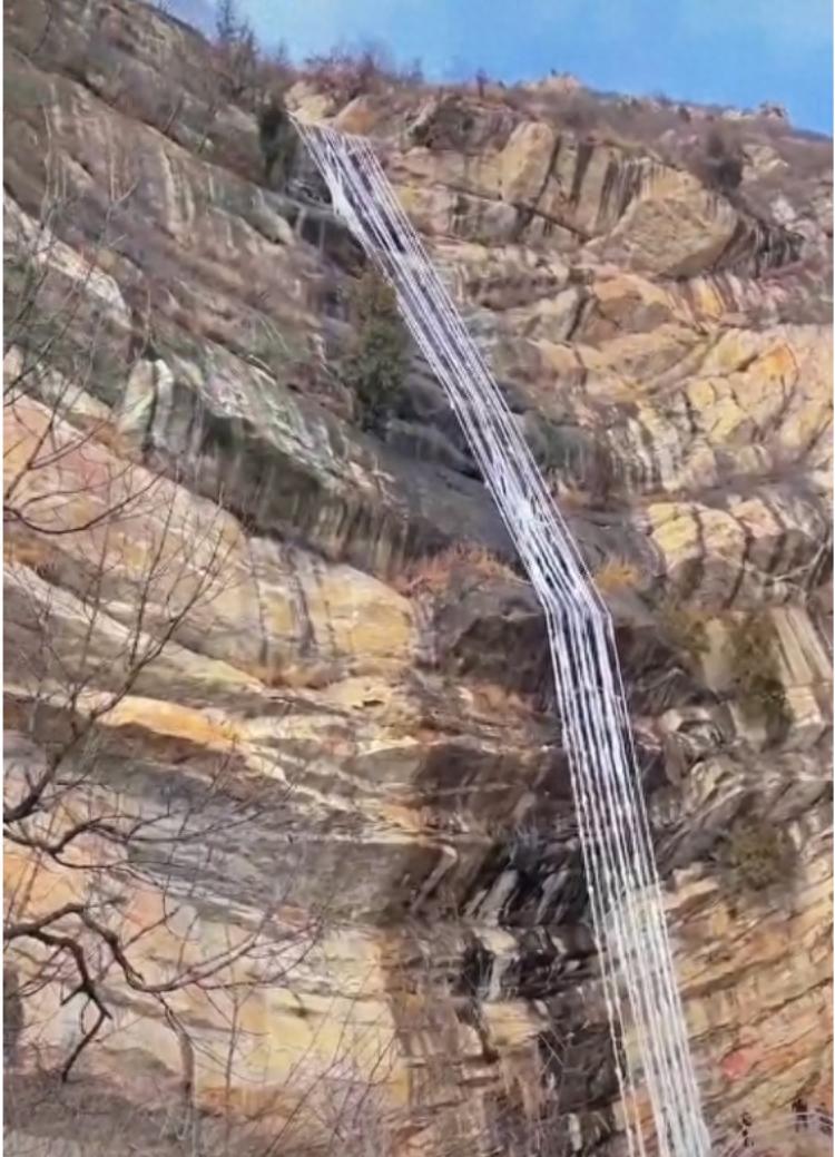 楊先生的視頻發布后,不少網友好奇這個瀑布大冰掛是否是天然形成。從部分網友發布的另一角度圖片看,瀑布中出現了疑似纜繩的粗線,冰掛都是順著繩子結冰。