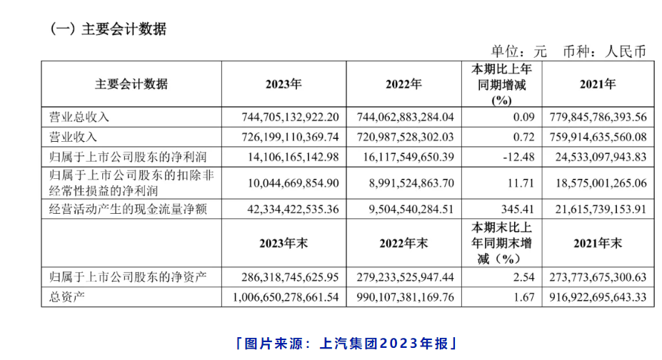 財報中顯示,2023年,上汽集團實現營業總收入7447.1億元,幾乎與2022財年持平;歸母凈利潤141.1億元,同比下降12.5%。