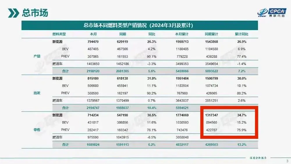 相關(guān)數(shù)據(jù)顯示,2024年第一季度我國新能源汽車銷量中,純電動(dòng)車型銷售89.5萬輛,同比增長15.2%;插混銷售42.3萬輛,同比增長75.9%。