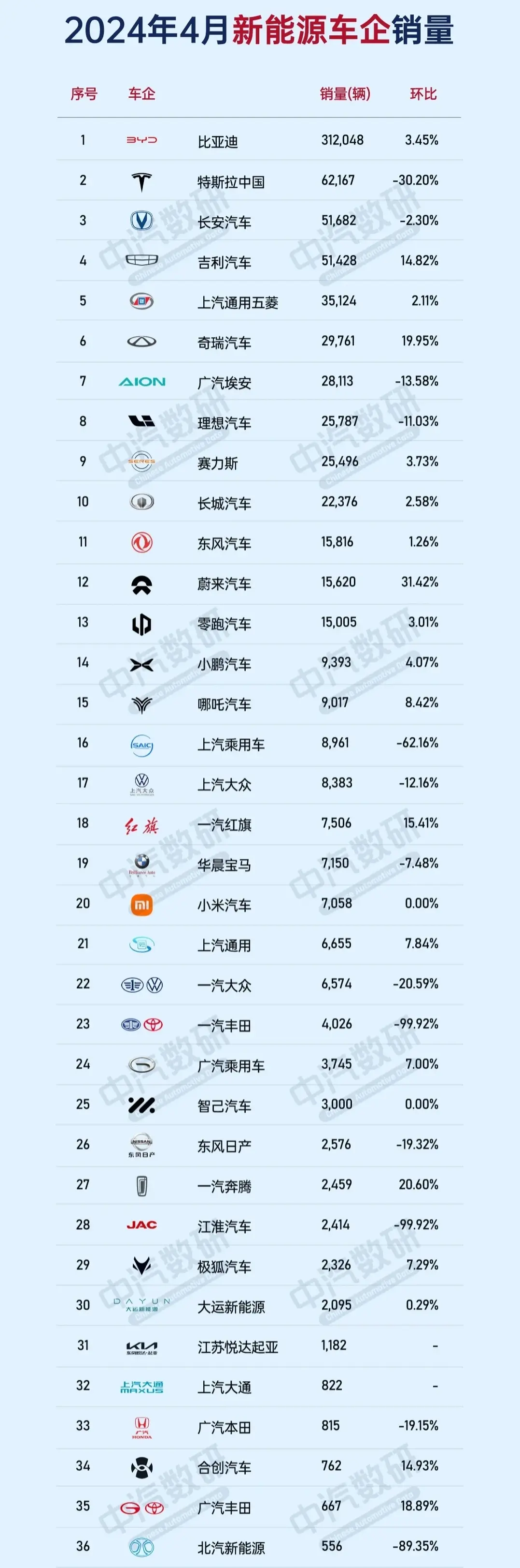 小幅降價的特斯拉還是沒有扭轉(zhuǎn)一季度的頹勢,銷量環(huán)比大幅下降30%。前面的文章曾經(jīng)討論過這個問題,在價格戰(zhàn)的大環(huán)境下,大量的B級車售價開始向15萬的區(qū)間靠攏,而特斯拉1.4萬的優(yōu)惠明顯誠意不足。如果特斯繼續(xù)保持下行的趨勢,很有可能在今年下半年被吉利或長安超越。(有興趣的讀者可以參考前文《特斯拉和理想全系降價,但誠意明顯不足》)