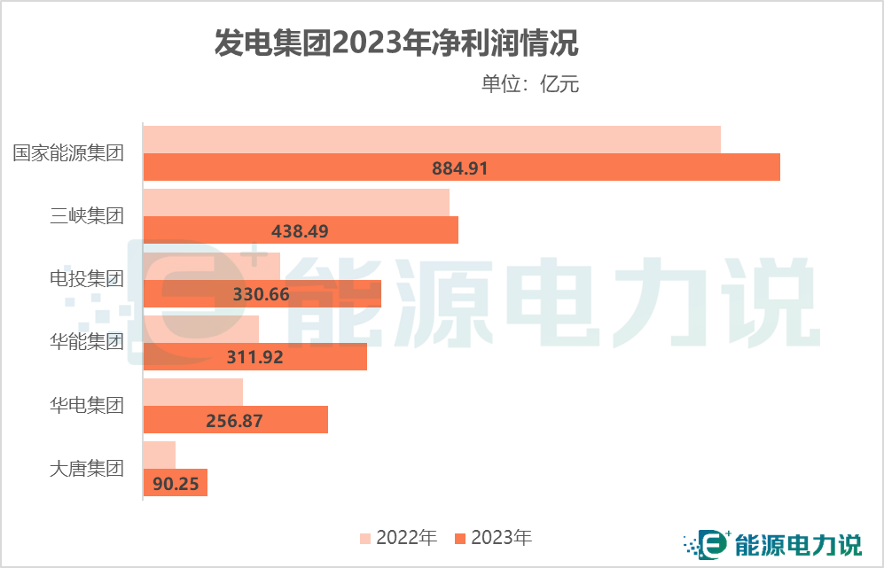 營收方面,2023年國家能源集團領先達7932億元,其次是華能4098億元,電投3857億元;同比增幅方面,電投增幅最大達6.97%,華電增長6.32%,三峽增長4.12%,大唐也有少量增幅1.66%;國家能源集團、華能集團有略微下降。