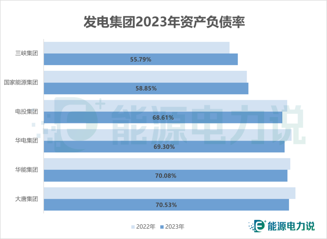 負債率方面,電投集團、華電集團、華能集團、大唐集團負債率有小幅降低,國家電投負債率小幅上漲;三峽集團負債率增幅最大,但仍是六大發電集團負債率最低的。