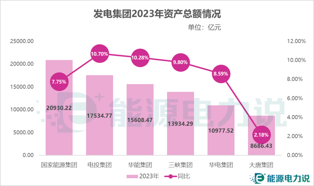總資產方面,2023年國家能源集團總資產超兩萬億,電投、華能、三峽、華電均超萬億;同比增幅方面,六家發電集團總資產均有增長,其中電投集團、華能集團增幅超10%。