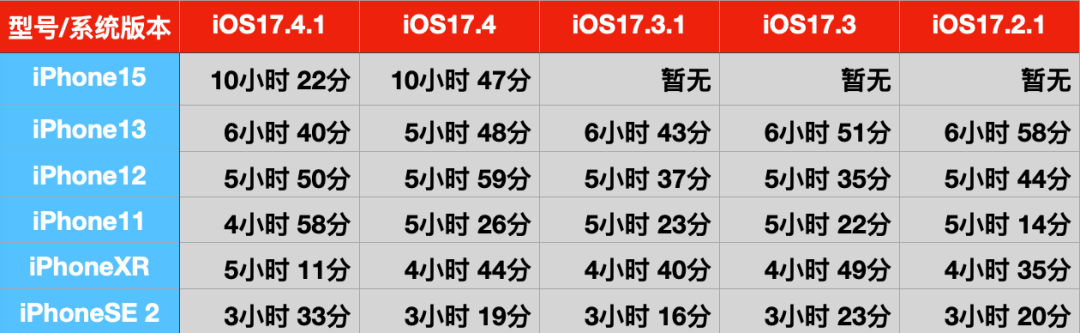 而從之前的系統(tǒng)對比來看,iOS17.4.1 在各個老設(shè)備上均有變化,像 iPhone13 續(xù)航水平明顯提升了,而 iPhone11 則出現(xiàn)了明顯的下滑。