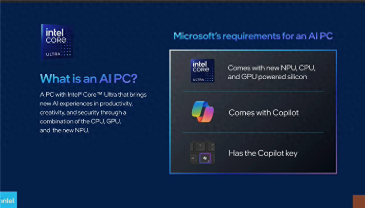 簡單來說,微軟與英特爾認為AI PC必須滿足以下這三點要求:一是處理器必須配備NPU、CPU以及GPU;二是必須支持微軟Copilot;三是鍵盤上必須配備Copilot物理按鍵。