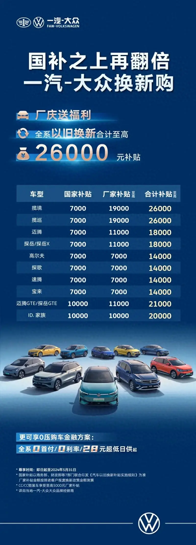 5月11日一汽-大眾推出了國補之上再翻倍換新購優惠活動。根據該活動,購買一汽-大眾全系車型的消費者可以獲得最高26000元的補貼。
