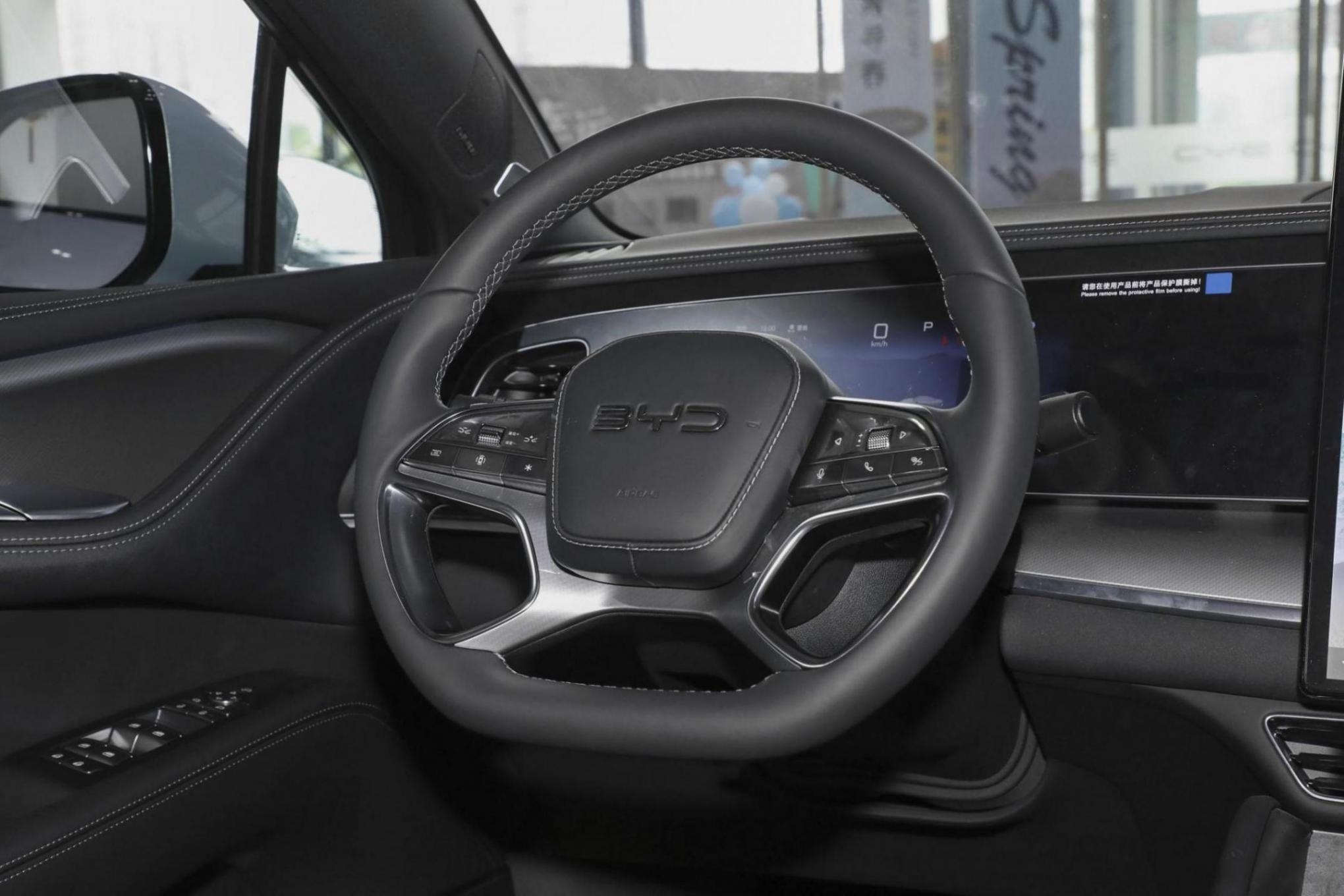 新車的內飾布局也是很用心的,它的中控配備了平底四輻運動方向盤,精心打造的水晶排擋桿融合了鋁材加工技藝,排擋桿四周的按鍵布局合理,集成了啟動、緊急告警燈、自動泊車、空調等常用功能,可以說海獅 07 EV具有濃厚科技感的同時,還有著不錯的實用屬性。