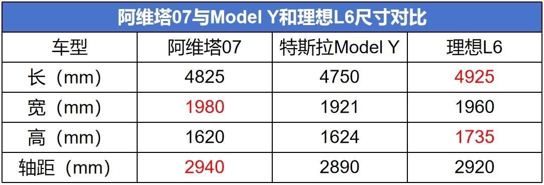 由于整車定位比阿維塔11更低,所以在尺寸上阿維塔07也要小了一些,整車長寬高尺寸分別為4825/1980/1620mm,軸距為2940mm。相比特斯拉Model Y來說,阿維塔07還是有著不小的優勢,且軸距也要比理想L6更長。