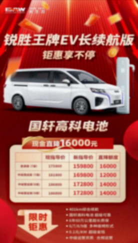 銳勝王牌E-M7推出非常有誠意的優(yōu)惠政策,以更優(yōu)的產(chǎn)品和服務(wù),讓更多用戶能夠購買到高性價汽車。現(xiàn)在購買還享用最高16000元的優(yōu)惠福利紅包,如果您正在挑選一輛大空間、高配置、經(jīng)濟(jì)實(shí)用的商家兩用車型,不妨去試駕銳勝王牌E-M7,萬元權(quán)益再加碼,獲得更優(yōu)的駕乘體驗(yàn)。現(xiàn)在訂購享有購車好禮,如感興趣,全國各地都有經(jīng)銷商,歡迎到店咨詢。
