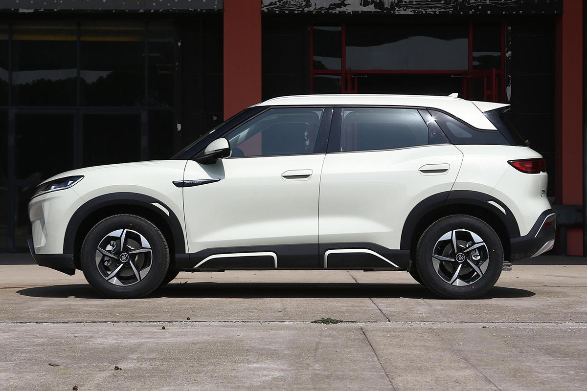 車身側(cè)面部分,車頂使用了懸浮式的效果,折痕式的腰線和下邊裙線造型很硬朗,包括黑色的大輪眉和下包圍還營造出了硬派SUV的視覺效果,下包圍上的亮色裝飾和前杠下包圍相呼應(yīng),視覺效果很個性。