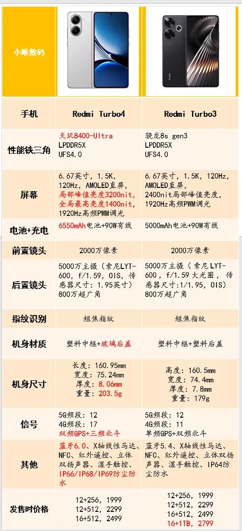 如下為紅米Turbo4與前代參數配置對比圖: