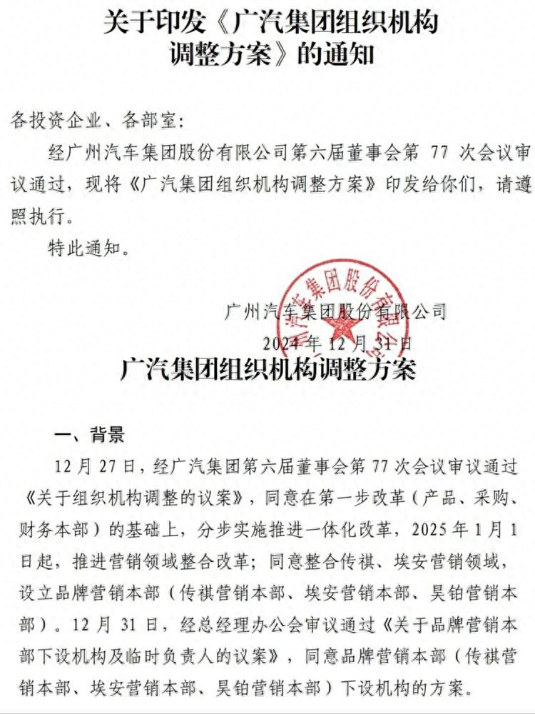 此前的12月27日,經廣汽集團第六屆董事會第 77 次會議審議通過《關于組織機構調整的議案》,同意在第一步改革(產品、采購、財務本部)的基礎上,分步實施推進一體化改革,2025年1月1日起,其將推進營銷領域的整合改革,同意整合傳祺、埃安營銷領域,設立品牌營銷本部(包括傳祺營銷本部、埃安營銷本部、昊鉑營銷本部)。