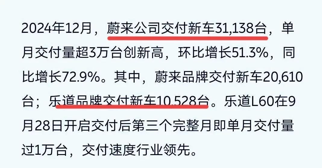 2024年的第一天,蔚來就給新能源車圈送上一份"開門紅"。 12月交付量31138輛,打破了自家記錄。 更讓人眼前一亮的是,其中光樂道這款車型就賣出了10528輛。