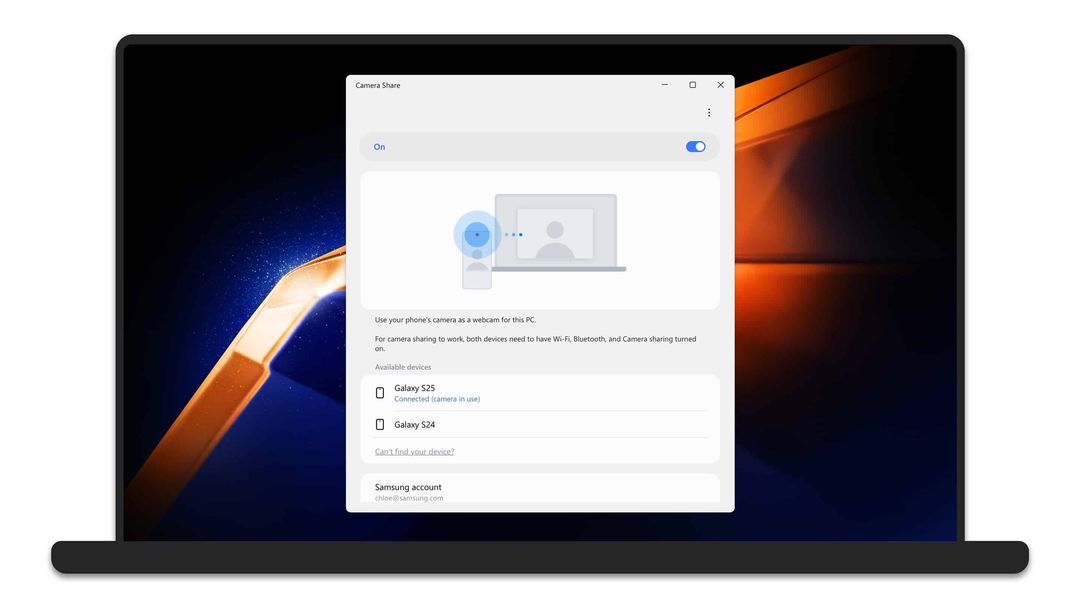IT之家注: Camera Share 是一款讓 Galaxy 手機作為 Galaxy Book 筆記本電腦攝像頭的應用程序。目前該應用仍在開發中,從而增強 Galaxy 生態系統,實現三星產品間的無縫連接。