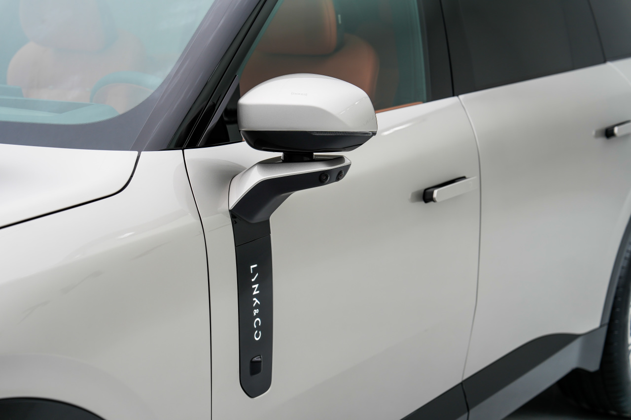 6、 前飾板裝飾條也是攬勝同款豎線設(shè)計(jì),但是領(lǐng)克的字母Logo能夠發(fā)光交互,后視鏡也是懸浮設(shè)計(jì),看上去比領(lǐng)克08更加粗壯有力。