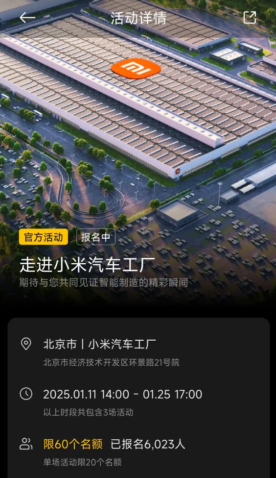 我們將在2025年逐步開放參觀,點擊小米汽車App社區-官方-頂部banner ,填寫報名信息并選擇參觀時間。我們將在小米汽車App公布入選名單,并電話方式通知。”