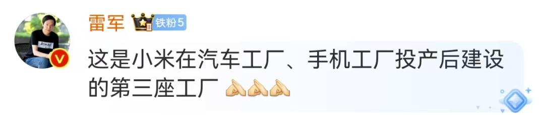 雷軍在評論區回復:這是小米在汽車工廠手機工廠投產后建設的第三座工廠。