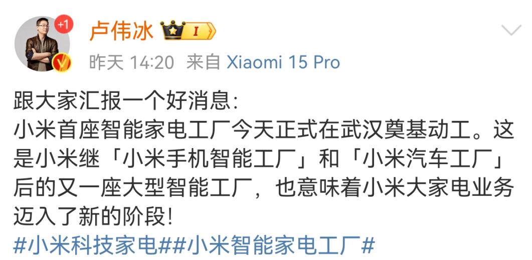 據小米集團合伙人、總裁@盧偉冰 微博:11月26日小米首座智能家電工廠正式在武漢奠基動工。