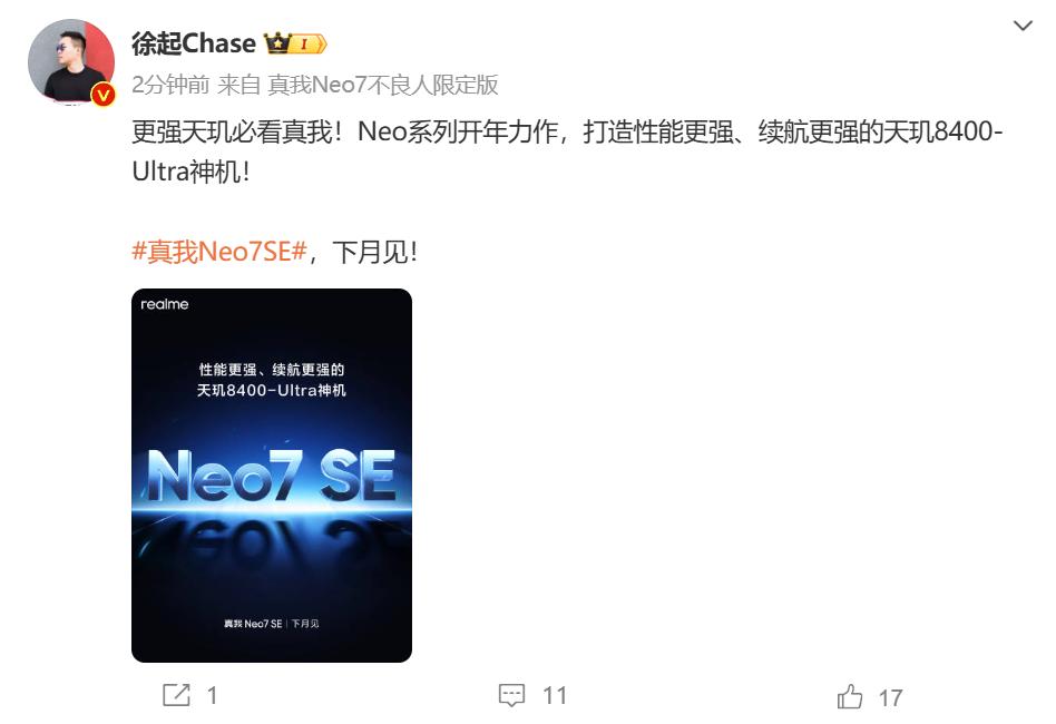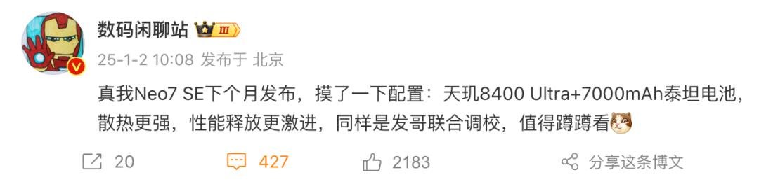 在1月2日上午,真我手機宣布將在下月發布真我neo 7se,和紅米Turbo 4一樣也是搭載天璣8400處理器,完全是對標紅米Turbo 4,同樣是聯發科的處理器,真我很有可能調的會更好一些,在宣傳語上就有暗示,說這款手機是性能更強、續航更強的天璣8400-max手機,有更出色的散熱配置,性能釋放可能會更激進一些,倒是值得等待一波。