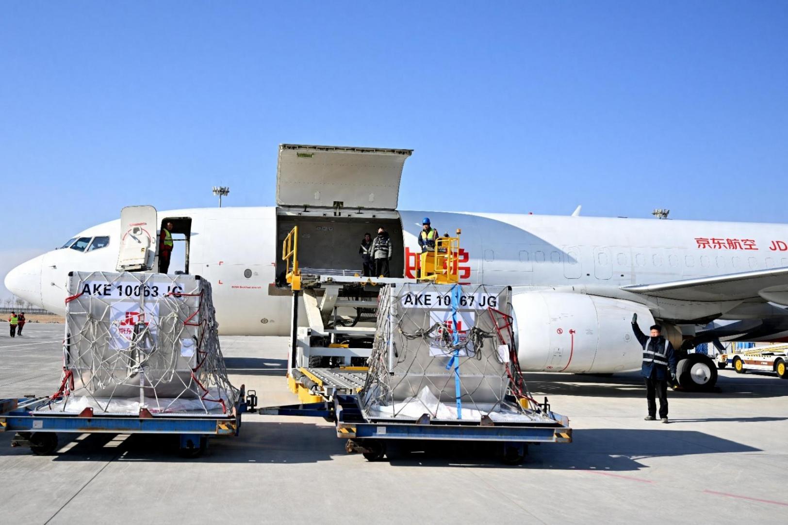 1月4日,銀川河東國際機場,京東物流寧夏牛羊肉全貨機進行貨物裝載。春節臨近,京東物流開通全貨機發運寧夏牛羊肉等特色生鮮產品,預計今年搭乘京東物流全貨機出港的寧夏牛羊肉500噸左右。