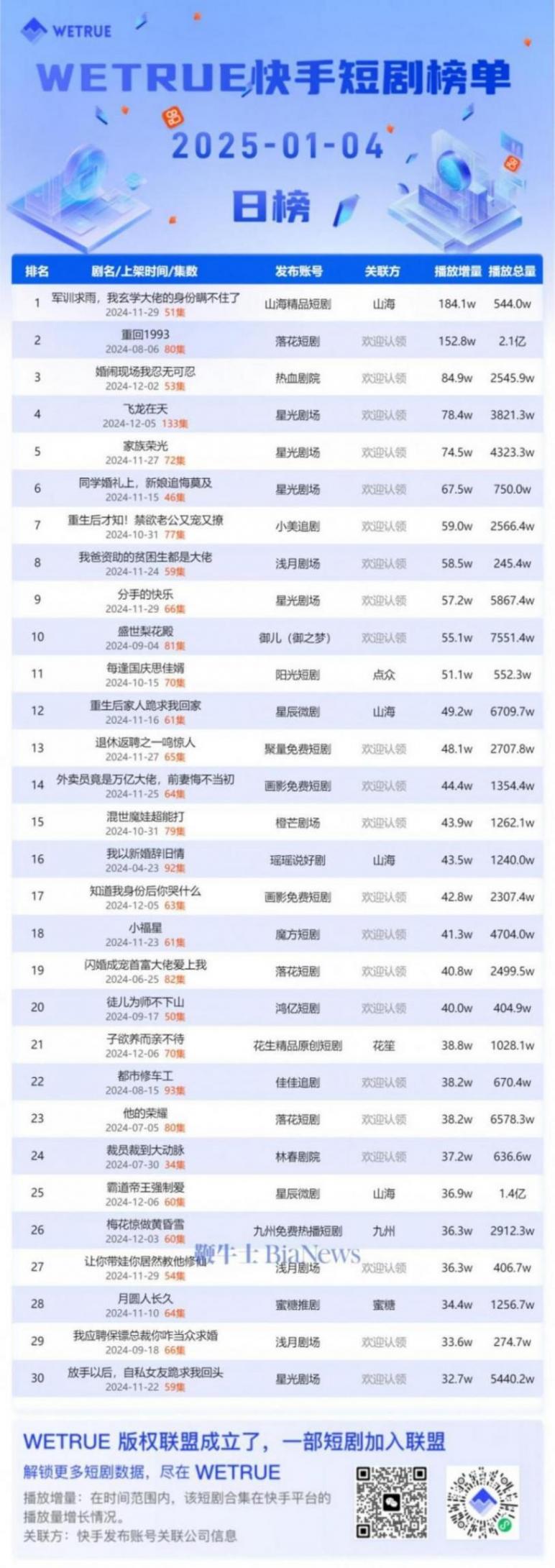 1月5日消息,為幫助短劇從業者提供更多信息,專注于短劇報道的新腕兒和科技媒體鞭牛士聯合WETRUE短劇熱度榜共同推出多種短劇熱度榜。