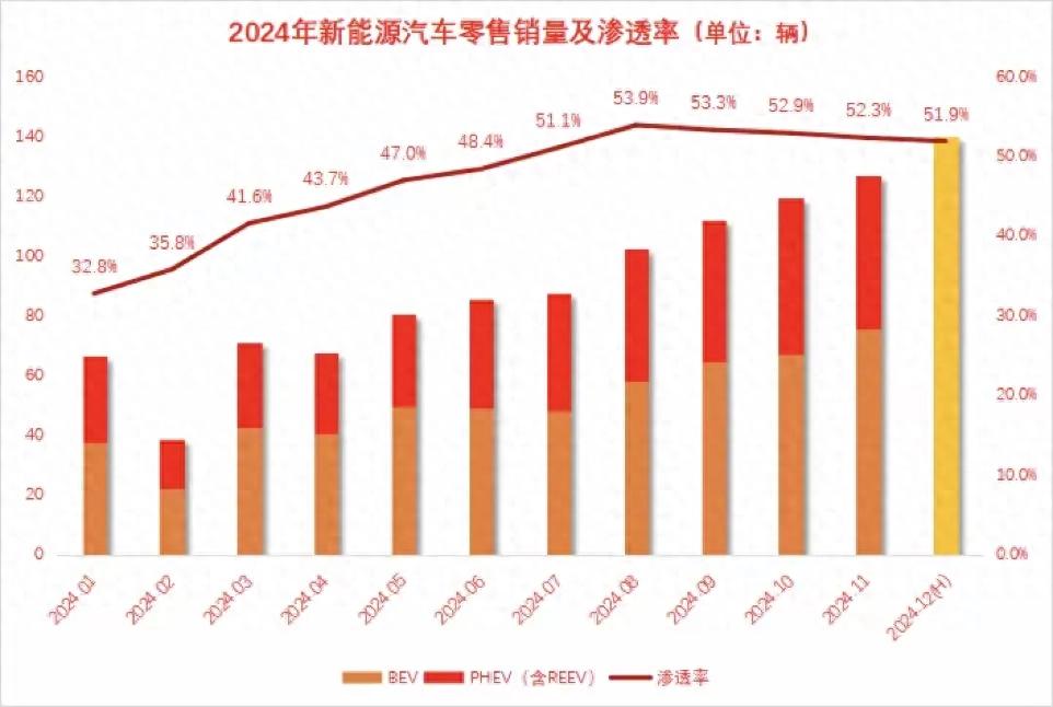 從2024年新能源滲透率來看,上半年滲透率不斷攀升,但到了下半年滲透率基本上保持在53%左右,且呈下降趨勢。這說明在國內新能源和油車銷量已經基本持平且處于拉鋸狀態,想買新能源的還是那一波人,不想買新能源堅持油車的那一波人也不會去考慮新能源。