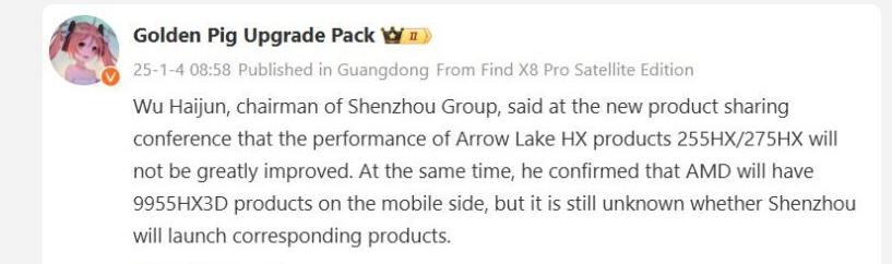 看到這里,有些朋友可能會質疑這個消息的來源和可靠性。總體來說,這個消息是非常可信的,因為這是國產電腦廠商神舟董事長吳海軍近日在新品分享會上所分享爆料的(請參閱上圖),另外還有其他權威博主背書,請參閱下圖。