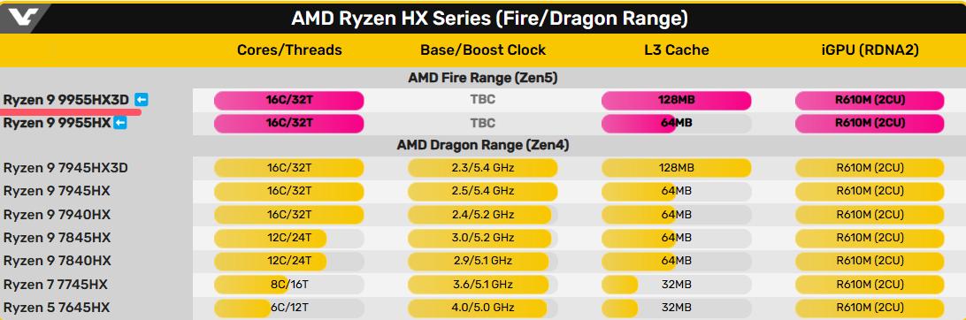 Ryzen 9 9955HX3D隸屬于 Fire Range系列,擁有16核32線程,L3級緩存為64 MB,搭載64 MB 3D V-Cache,加在一起總L3級緩存容量為128 MB,仍然搭載Radeon 610M核顯,至于運行頻率等其他參數目前未知。