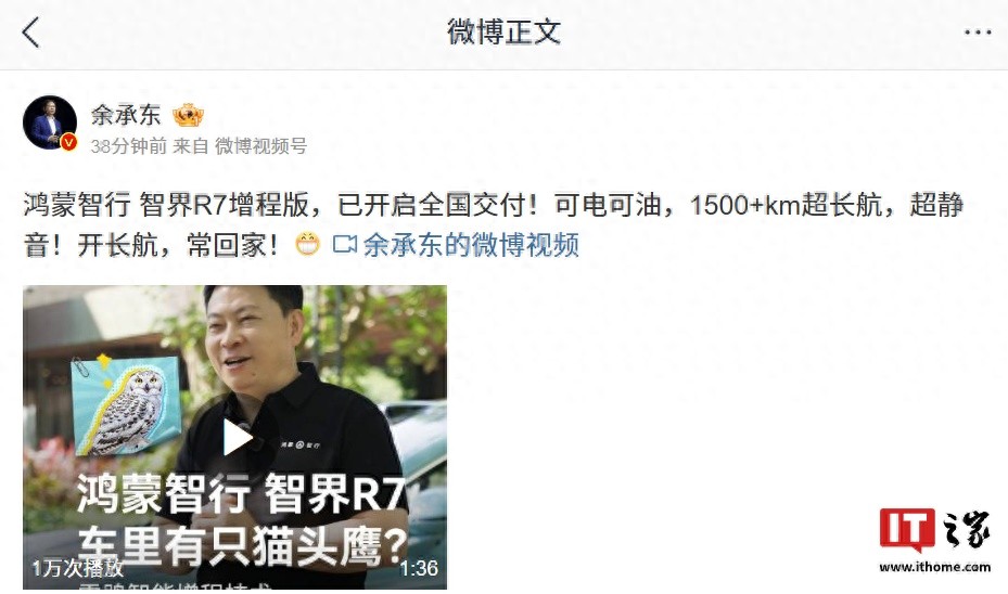 1 月 5 日消息,華為常務(wù)董事、終端 BG 董事長、智能汽車解決方案 BU 董事長余承東今日發(fā)文宣布,鴻蒙智行首款轎跑 SUV—— 智界 R7 增程版汽車開啟全國交付。