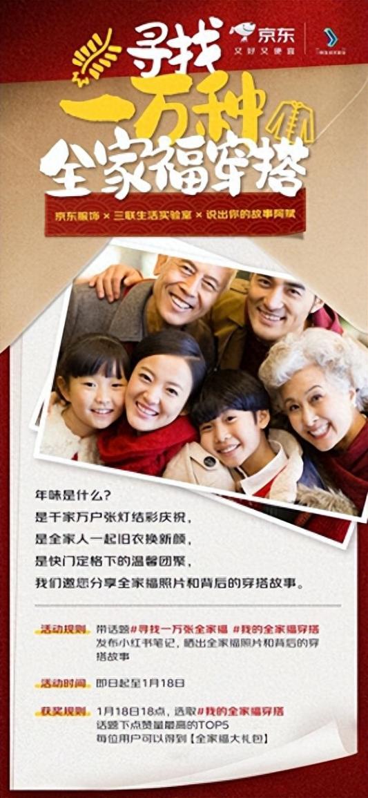 根據活動規則,即日起至1月18日,帶話題#尋找一萬張全家福、#我的全家福穿搭 發布小紅書筆記,曬出全家福照片和背后的穿搭故事,話題下點贊量最高的TOP5的用戶,可以得到由京東服飾提供的價值超500元的全家福大禮包。
