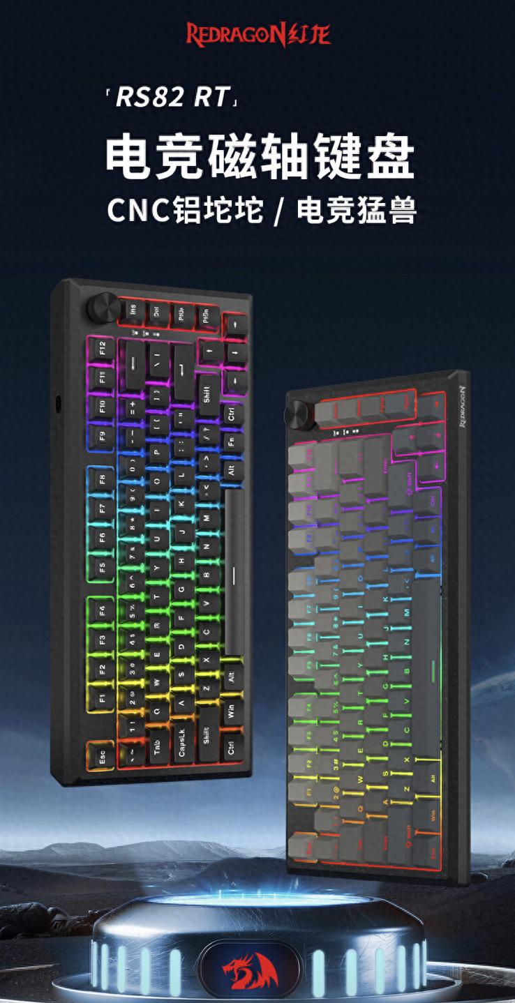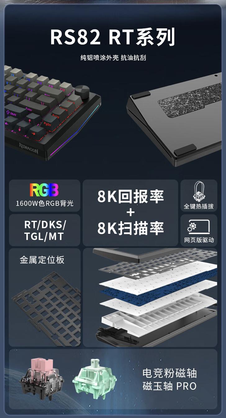 1 月 6 日消息,紅龍 RS82 RT 有線電競磁軸鍵盤將于今天 19:00 開啟首銷,這款鍵盤主打“8KHz 回報率、0.01mm 磁軸”,IT之家整理價格如下: