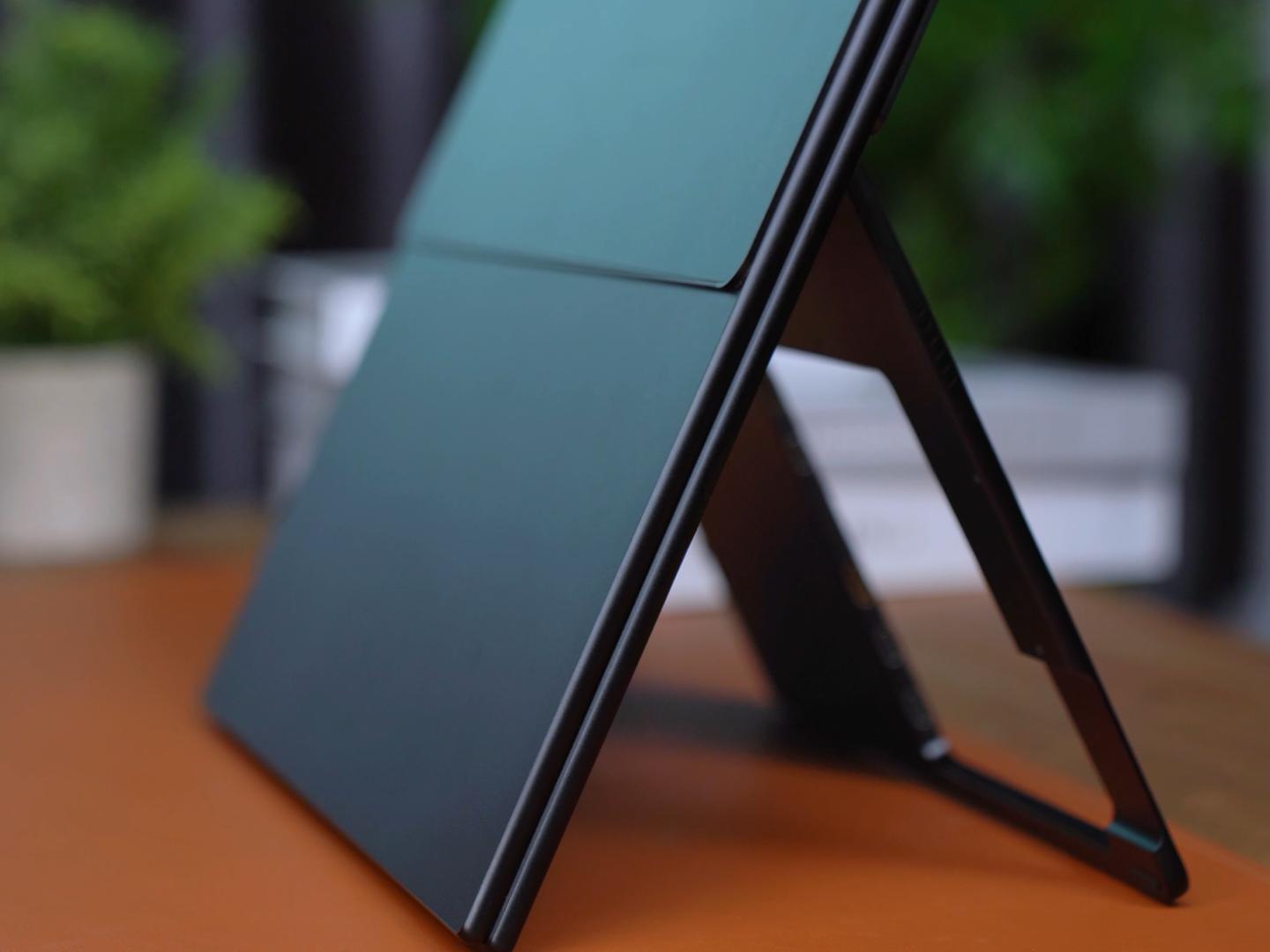 兩塊屏幕之間是鉸鏈連接,阻尼感強(qiáng),360°旋轉(zhuǎn)放置都非常穩(wěn)固,甚至豎屏展示。屏幕的下方增加了橡膠防滑墊,確保了擺放的穩(wěn)固性。